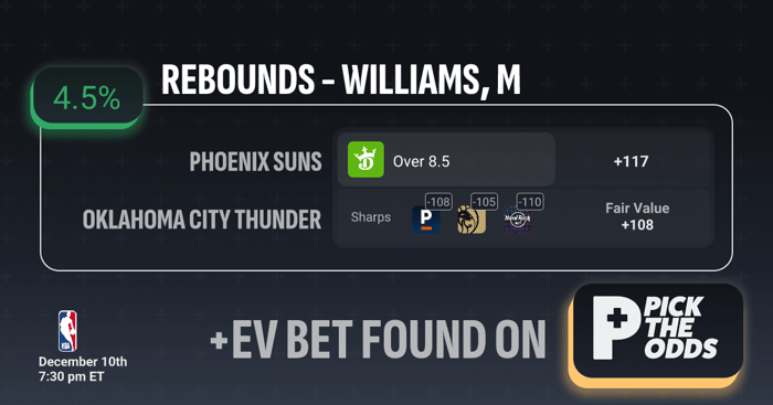 This Williams Over 8.5 rebounds play shows a 4.5% EV, driven by a clear gap between the market number and what the sharp books are implying. While sharp outlets are pricing this prop in the -105 to -110 range, the model’s fair value of +108 confirms that the true odds should be significantly shorter than what the public market is offering. Getting +117 creates pure value — you're grabbing a number that’s well above both the sharp consensus and the fair price, meaning the payout outpaces the actual probability of the over hitting. That discrepancy between sharp lines and the available price is exactly where the +EV edge comes from.