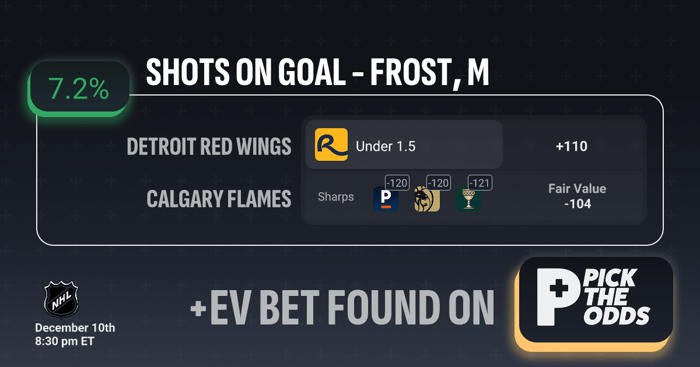 This Frost Under 1.5 SOG play grades out as a 7.2% +EV bet because the available +110 price is well above what the sharp books and the model say it should be. Sharps are sitting in the -120 to -121 range on this under, and the calculated fair value is -104, meaning the true probability of the under hitting is significantly higher than the implied odds you’re paying. Anytime you can take a prop at plus money when both the sharp market and the fair-value model price it as a strong favorite, you’re capturing clear line value — and that gap between +110 and a fair price of -104 is exactly where the EV edge comes from.