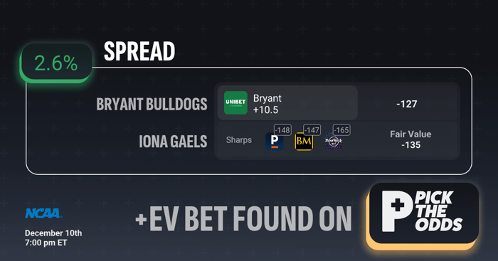 This Bryant +10.5 play rates as a 2.6% +EV bet because the available –127 price is meaningfully better than what the sharp books and the model indicate. Sharp sportsbooks are posting this line between –147 and –165, and the model’s fair value sits at –135, showing that the true probability of Bryant covering is higher than the implied odds you're paying. Anytime you can grab a spread at a cheaper price than both the sharp consensus and the fair-value projection, you’re capturing clear market inefficiency. That gap between –127 and a fair value of –135 is where the +EV edge comes from.