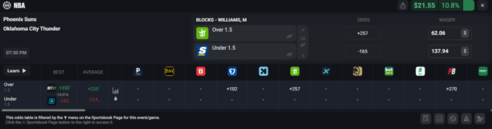 Let's say you take Williams Over 1.5 Blocks on DraftKings at +257 odds for $62.06. If this side hits you win $221.