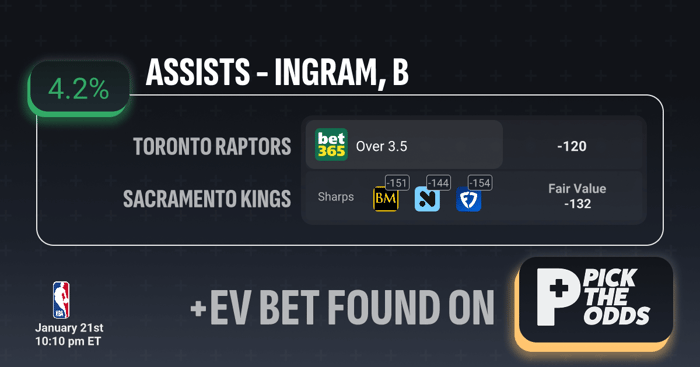Brandon Ingram Over 3.5 Assists is a strong +EV play at +4.2%, as we’re getting -120 odds on a line that prices out closer to -132 fair value, creating clear value. Sharp sportsbooks are signaling even heavier confidence, with respected markets pricing this prop at -151, -144, and -154, well above what’s currently available. That gap between sharp consensus and market price indicates mispriced odds in our favor, meaning we’re beating both the books and the sharpest lines. When you combine the positive expected value, sharp alignment, and discounted price, this bet checks all the boxes of a long-term profitable +EV wager.