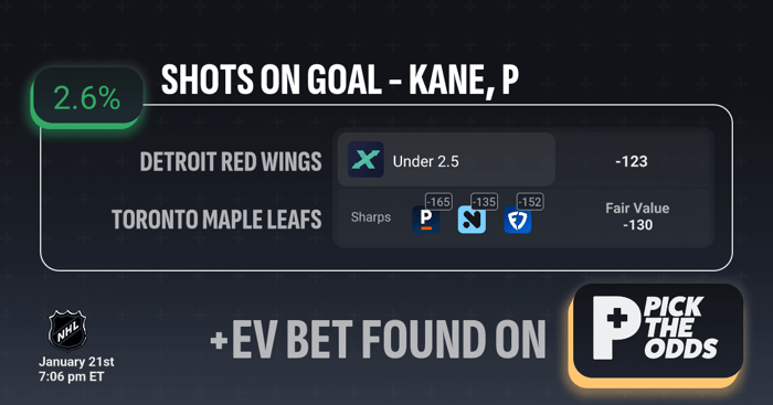Patrick Kane Under 2.5 Shots on Goal is a strong +EV opportunity at +2.6%, as we’re able to grab this line at -123 odds while the fair value sits closer to -130, indicating the market is offering a discount. Sharp sportsbooks are even more aggressive on this under, with respected books pricing it at -165, -152, and -135, showing clear alignment from sharp money. When multiple sharp lines are significantly worse than what’s currently available, it’s a strong signal the number is mispriced. Combining the positive expected value, sharp consensus, and favorable odds, this under presents a solid long-term +EV edge.