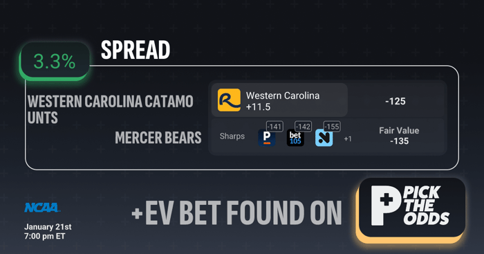 Western Carolina +11.5 is a strong +EV play at +3.3%, as we’re able to get the Catamounts at -125 odds while the fair value is closer to -135, signaling clear market inefficiency. Sharp sportsbooks are backing this side as well, with respected books pricing Western Carolina +11.5 at -141, -142, and as high as -155, all significantly worse than what’s currently available. That sharp consensus suggests the true line should be shorter than +11.5, giving us extra cushion against the spread. When you combine the positive expected value, sharp alignment, and discounted odds, this becomes a textbook +EV spread bet.